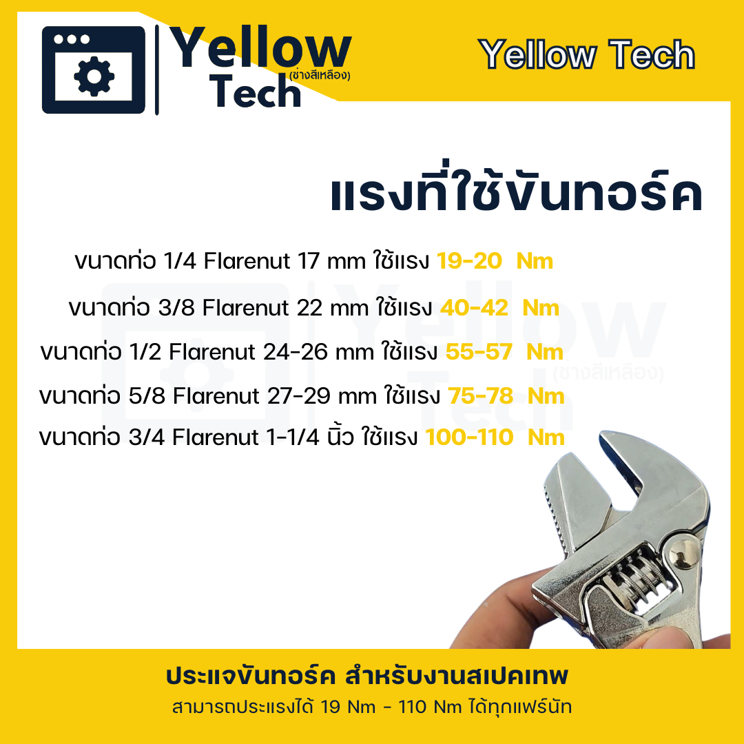 หมายเหตุสำคัญ: ค่าแรงขันอาจแตกต่างกันเล็กน้อยในแอร์บางยี่ห้อหรือบางรุ่น ควรตรวจสอบจากคู่มือการติดตั้งของผู้ผลิตร่วมด้วยเสมอเพื่อความแม่นยำสูงสุด การมีประแจปอนด์ช่างแอร์ที่ปรับตั้งค่าได้จึงเป็นข้อได้เปรียบอย่างยิ่ง